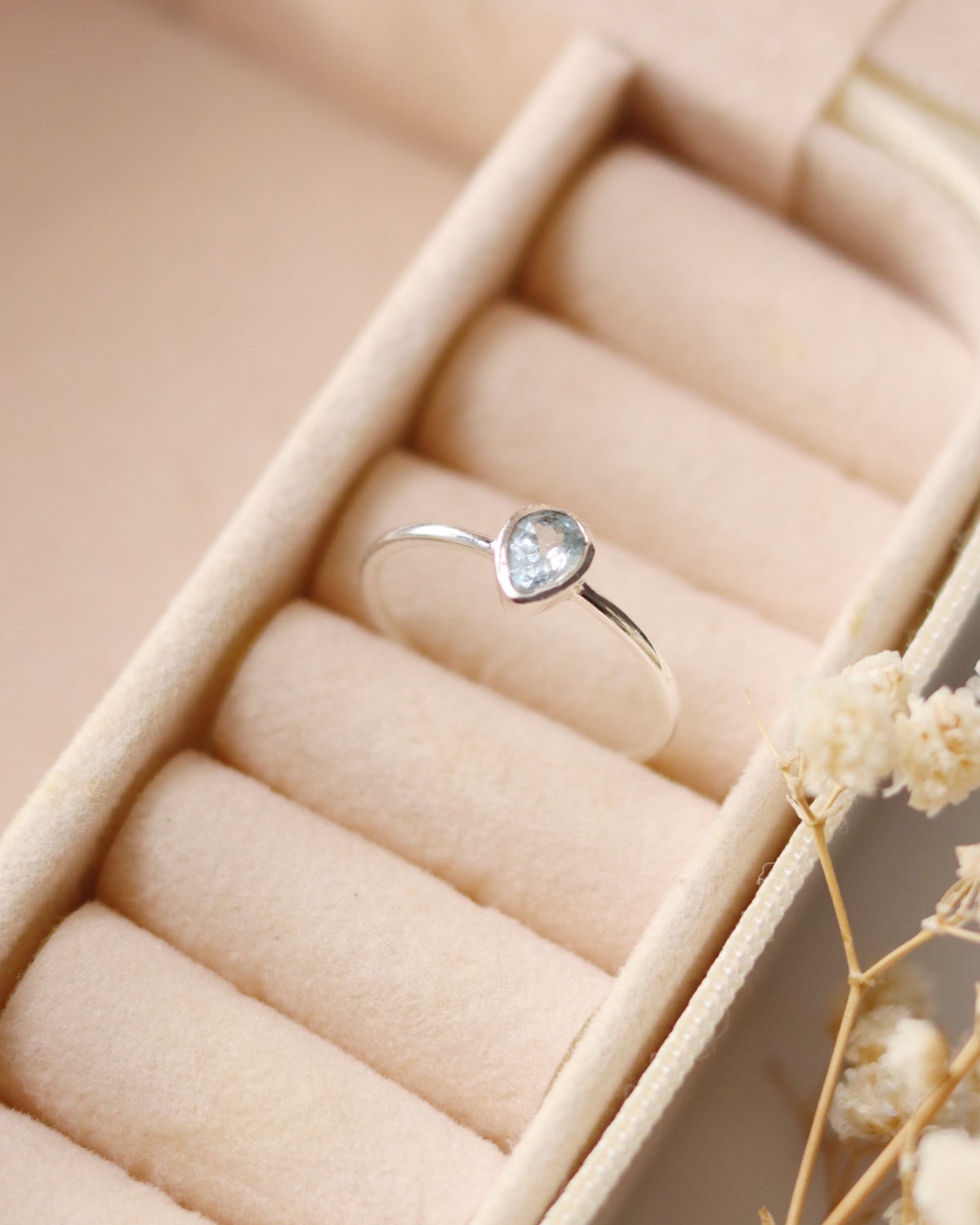 Celebrate March birthdays with the serene beauty of the Aquamarine Ring, featuring the birthstone that symbolizes tranquility and clarity. Aquamarine, with its soothing blue hues, is believed to bring calmness, courage, and protection to the wearer, evoking the peaceful energy of the sea. This elegant size 9 ring is crafted from sterling silver and plated with 18k white gold, giving it a sleek, polished finish that complements the gemstone's natural allure. Whether you're drawn to its calming qualities or its timeless elegance, the Aquamarine Ring is a perfect reminder of the peaceful strength within.