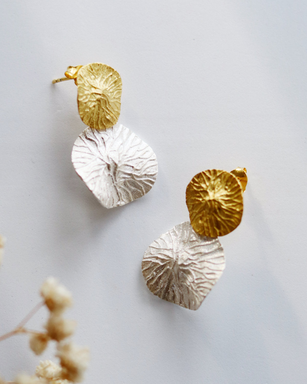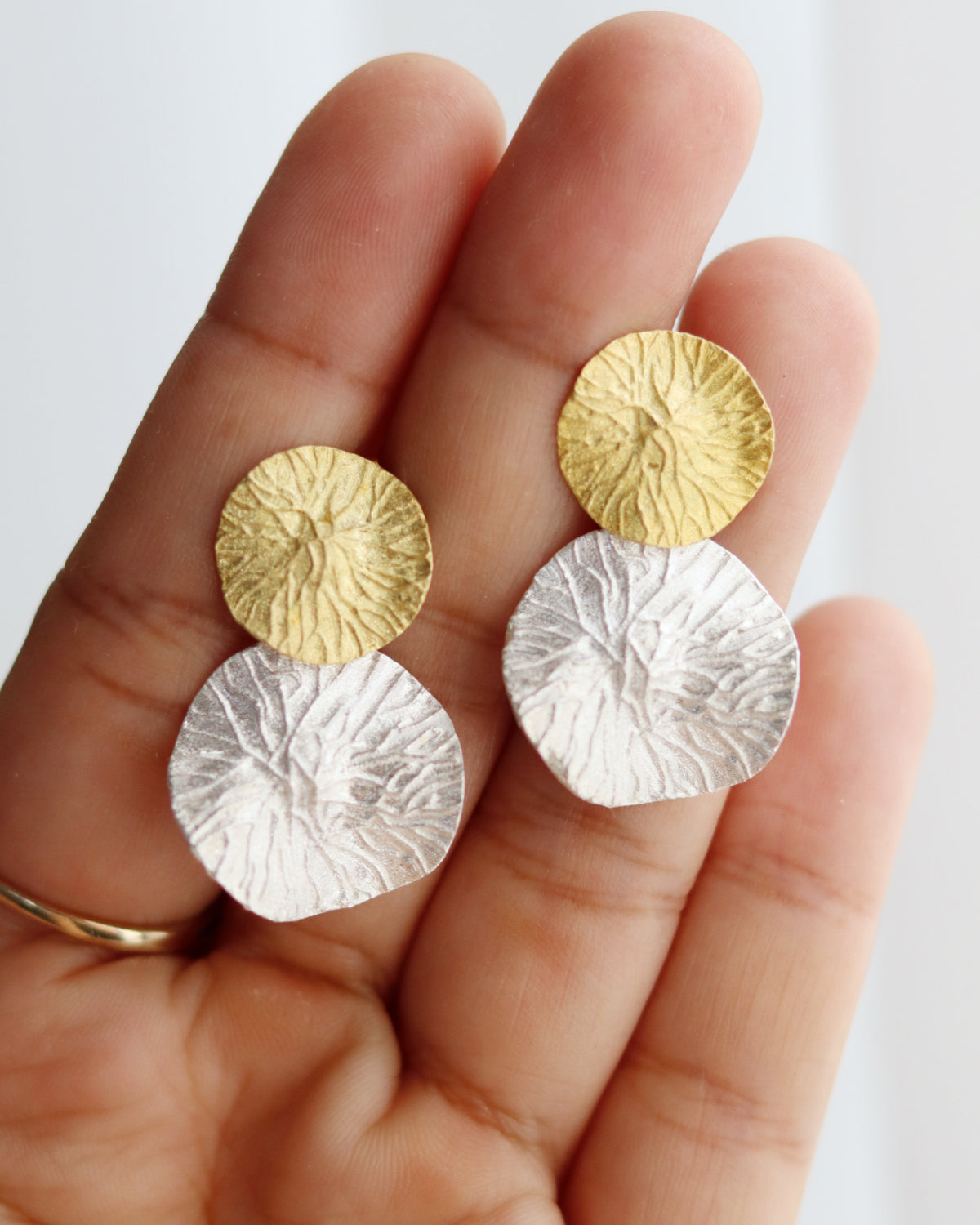 Inspired by the tranquil beauty of water lilies, the Lily Pad Earrings from the Wild Flora collection are crafted from sterling silver and feature a striking mix of matte gold and silver finishes. These stud earrings delicately capture the organic shape of lily pads, offering a blend of nature-inspired elegance with a subtle two-tone contrast. Their versatile design makes them perfect for everyday wear or as a refined touch for special occasions, embodying the serene grace of nature.