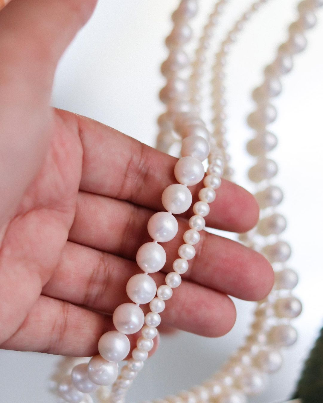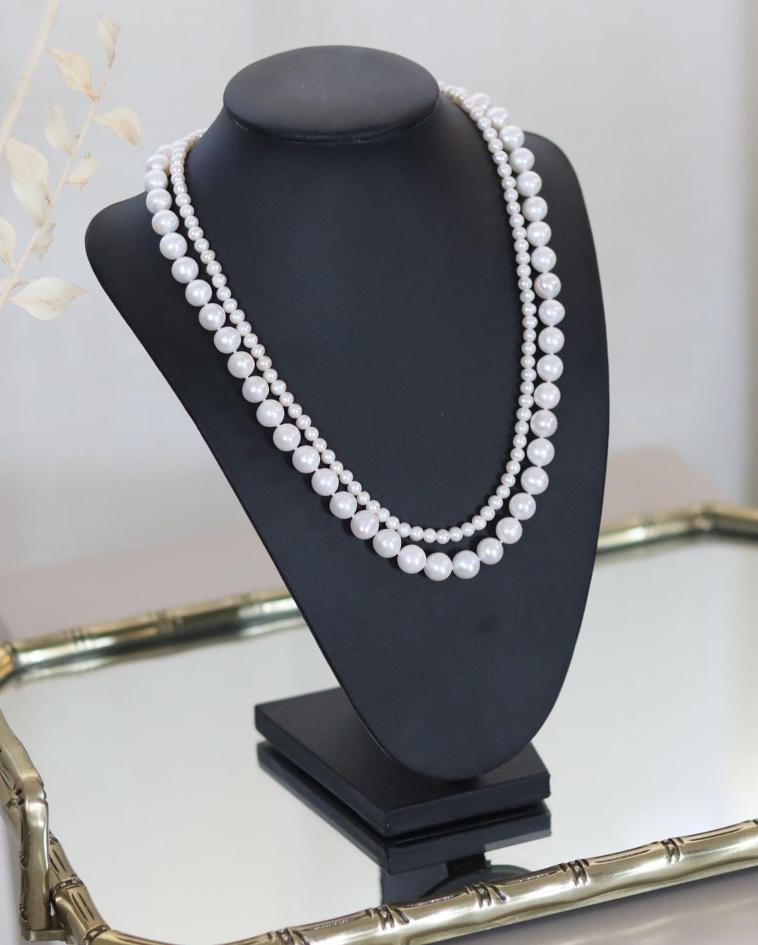 This gorgeous pearl necklace is a play on proportion. It combines 4mm and 10mm pearls in a design that begs to be layered! Wear it by itself or with your favorite chunky gold chain.