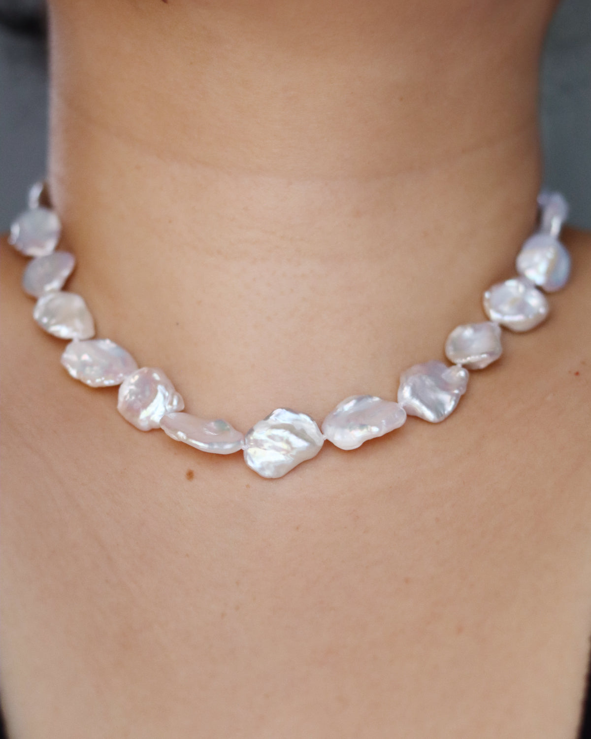 Originally crafted exclusively for beauty editor Belle Rodolfo, this stunning piece is now part of our regular collection by popular demand. The Belle features luminous coin keshi pearls, each measuring 15–20 mm, showcasing their unique, organic charm. The necklace is 16 inches long, adjustable to 18 inches, offering flexibility for any neckline. Designed to capture Belle's ultra-modern style, this piece is perfect for those who embrace bold elegance with a contemporary edge.